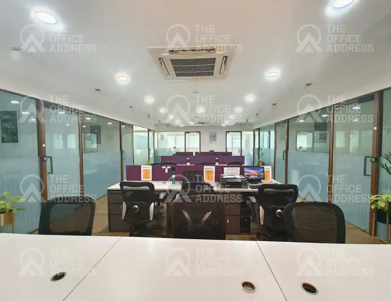 Amenities include high-speed internet, meeting rooms, printing and scanning, comfortable seating, backup power, and pantry.