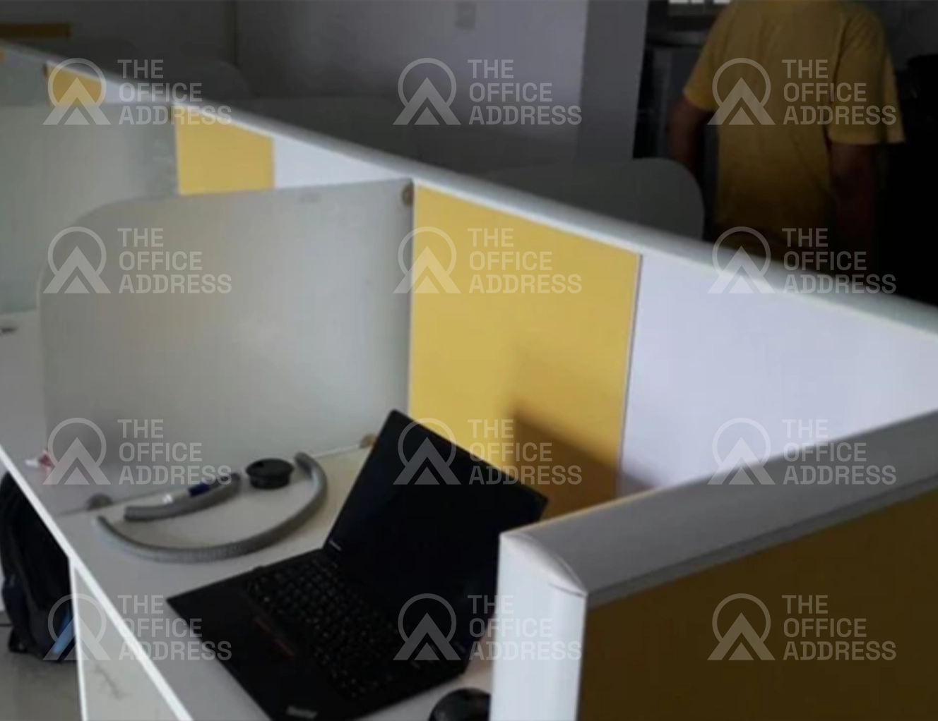A fixed desk in a shared coworking space.